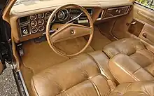 The Town & Country's grille insert and wheel covers for this new generation were from the New Yorker, while front seating choices and interior trim were again drawn from the Newport Custom. The new instrument panel featured a symmetrical padded loop echoing the design theme of the front end. The inverted fan style speedometer from 1967 and 1968 continued, balanced on the passenger side by a large glove box door. A unique Chrysler feature was floodlighting of the instruments and controls instead of more typical backlighting.[7]