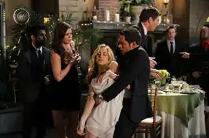 At Chuck and Sarah's rehearsal dinner, Morgan tells Alex that he will stop going on missions and simply become an analyst. Chuck's sister Ellie (Sarah Lancaster) is unable to make her own video montage, having previewed and rejected Lester's deeply disturbed first cut. However, Jeff offers his own flawless cut of the montage, being rewarded with a kiss from Ellie. During the video, Chuck gets a phone call from Vivian, who intends to make him suffer. Vivian activates the Norseman device on a target at the dinner, who Chuck initially fears is his mother. Suddenly, Sarah's nose starts to bleed and she collapses in Chuck's arms as he calls out for help.