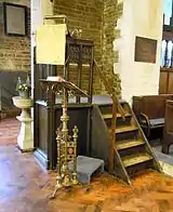 The north wall dates from 1649 and a number of architectural fragments, believed to be from Chicksands Priory, have been incorporated in this and other walls in the church. The monuments set in the wall are dedicated to Sir Danvers Osborn and the Rev. Arthur McGee, the last Rector resident in the village. The ornate baptismal font was installed c. 1893 and commemorates the Hon. Charlotte Osborn. The Gothic-style lectern is late 19th century while the pulpit is constructed from parts of a 14th-century screen which includes a traceried panel.