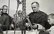 A committee was formed to screen the project, which was entrusted to engineer Claudio Latocca[3] and carried out with the collaboration of architects Olgiati and Sartorio.De Carli (1994, p. 141) The work was supported through collections and offerings of gold from the faithful.[4] In addition, the parish proceeded to sell some areas of the land it owned, which it had received as a donation from benefactress Catina Cornelio.[5] On March 3, 1957, Cardinal Giovanni Battista Montini, archbishop of Milan, laid the foundation stone,[6] and work continued until 1961, when it was completed. The initial project also included the construction of a "Parish Works Center," connected to the church through a portico, and a bell tower, both of which were never built.[3] On March 19, 1961, the church was blessed by Monsignor Mario Civelli, a missionary bishop in China of Balsamese origin, who celebrated the first Mass.[6] On the occasion of the celebration of Corpus Christi, the date of the consecration of the church by Cardinal Montini was announced, which was held on June 3, 1961.[7] Subsequently, Don Carcano arranged for the placement of the paintings depicting the Stations of the Cross.[8]