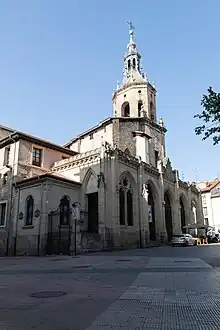 The Church of San Pedro Apóstol (Spanish: Iglesia de San Pedro Apóstol, Basque: San Pedro eliza) is a medieval church located in Vitoria-Gasteiz, Spain. It was built in the late 13th and early 14th centuries as a fortress church due to its location next to the city walls. The construction of the current tower started in 1708, while the southern portico (designed by Fausto Íñiguez de Betolaza in Gothic Revival style) was added in 1897.[1]