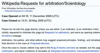 In January 2009, The Register reported on an ongoing case involving Scientology before Wikipedia's Arbitration Committee, "According to site administrators, several pro-Scientology accounts have been editing the site using Scientology-owned computers."[35] The Arbitration Committee on Wikipedia is composed of a group of volunteers elected by the editing community to resolve especially difficult conflicts.[36][37] During the arbitration case, the page about Scientology was modified by members of the organization.[35][38] Scientology members had doctored entries in order to advertise for their cause.[39] The Register noted that one of the Wikipedia users admitted he had edited from computers operated by the Scientology organization, "One of these pro-Scientology editors – who once used the handle 'COFS' – has admitted as much. And he vows to continue editing Scientology articles from Scientology computers."[35] The Register quoted the "COFS" user as saying, "I am not going to leave voluntarily and I will continue to use a) my own computer, b) public computers, c) my wireless laptop, d) computers in the Church of Scientology and any station I please".[35] The Guardian cited The Register, and noted, "The technology news website The Register alleges the church has an organised operation to challenge internet criticism."[40]