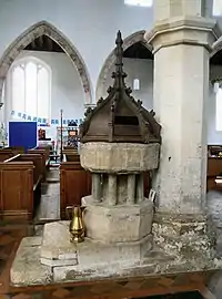 In the southwest corner of the nave can be found part of a 13th-century limestone marble slab, with an undeciphered inscription in Lombardic capitals along one margin. The communion rails were fitted at the bequest of William Meadston (died 1683). The door in the ground stage of the tower is formed of two leaves and is late-medieval, and originally was fitted in the west doorway. Prior to the restoration of 1880 there were two baptismal fonts in the church: one in the present position and one in the centre aisle. The present 13th-century font has an octagonal limestone marble bowl with two pointed arched panels in each face. The font's base has a cylindrical central pier with 19th-century peripheral shafts. The font's sub-base possibly incorporates the bowl of the earlier font which may well have been in use in the earliest church on this site.[4] The restored octagonal ogee font cover with crocketed ribs and finial is probably 16th-century.[1][2][4]