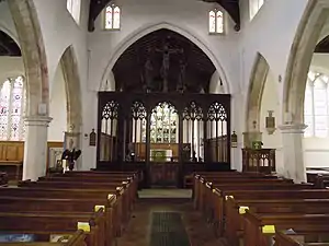 The rood screen is mainly late medieval, and is in five bays with the extra-wide middle bay being the entry. It has been much altered. The oldest parts are thought to have been in position after the restoration in the 1480s. Traces of the medieval paint colours of red, green, cream and gold still remain. At that time there would have been a small winding staircase (a vice) leading up to the top of the screen from behind the present pulpit. The doorway to the screen is still visible but the vice was bricked up in the Reformation. However the remains of the first few steps of the vice can be seen besides the modern pulpit.[4] The cornice infilling above the heads of the lights and gates are modern. In the north chapel can be found three remodelled pews, with an additional pew-end incorporated into modern seating. In the south chapel can be found two blocks of seating, each of four pews, similar to the seating in the north chapel but with original panelled fronts to the first pews. Nearby at the east end of the south aisle is a third panelled front incorporated into modern seating. With the exception of the first these seats are late medieval.[1][2]