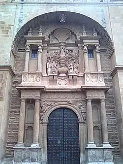 Construction of the church at this site in the then-expanding town was chosen in 1524. A number of architects including maestro Marquina, Maestro Pedro, Maestro Juan de Aranguren, Juanes de Segura, and Juan de Urrea took the work to 1579. The late-Renaissance portal has a relief depicting the Annunciation and Assumption of the Virgin. The façade was started in 1619-1624 by Francisco de Figuerola. Work continued on the sacristy, various chapels, and the bell-tower into the later half of the 18th century. From 1789 to 1805, Bartolomé Rivelles worked on the apse. The interior was decorated in Neoclassical style. Restoration took place in the 1980s.[1]