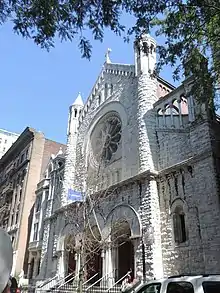 The elaborate midblock church, located on 107th Street between Amsterdam Avenue and Broadway, has an attached parish house, both designed in the Sicilian Romanesque of the Norman and Byzantine hybrid style and built between 1896 and 1897 to the designs by the American of German descent Roman Catholic church-building architectural firm of Schickel & Ditmars.[1] The parish has a four-storey brick and stone parochial school built by P. J. Brennan & Son, builders, in 1911 to designs by architect F. A. de Meuron of 31 East 27th Street for $120,000.[2] A five-storey brick dwelling house was erected at 218 West 108th Street in 1927 to the designs by architect Robert J. Reilly of 12 E 41st Street for $100,000.[2] The church was renovated in 1939.[1]