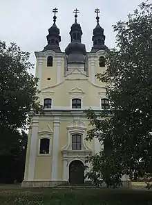 The provincial Baroque church lies along an east–west line; it is composed of a vestibule with a spire, a long rectangular nave and an altar with a semicircular apse. There are side apses where the nave joins the altar. The facades are simple. The main entrance is enclosed in a stone semicircle and flanked by half columns. The large Baroque iconostasis has several levels of Byzantine icons. The royal doors are decorated with leaves and roses.[1]
