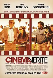 Cinema Verite is a 2011 HBO drama film directed by Shari Springer Berman and Robert Pulcini. The film's main ensemble cast starred Diane Lane, Tim Robbins, James Gandolfini and Patrick Fugit. The film follows a fictionalized account of the production of An American Family, a 1973 PBS documentary television series that is said to be one of the earliest examples of the reality television genre. Principal photography was completed in Southern California.[1] The film premiered on April 23, 2011.[2]