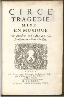 Circe was first performed on 1 October 1694[2] at the Paris Opera.[3] It was not received well; most of Desmarets' operas were said to have mimicked Lully's music in a way that produced material similar but inferior to it. No fault of Desmarets', Lully's monopoly on court music cast a shadow in which any potential individuality Desmarets had was quashed. This may have contributed to the generally negative sentiment toward his work evident in reviews written at the time.[4][5]