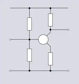 There is also a twin-T topology which has practical applications where it is desirable to have the input and output share a common (ground) terminal. This may be, for instance, because the input and output connections are made with co-axial topology. Connecting together an input and output terminal is not allowable with normal bridge topology and for this reason Twin-T is used where a bridge would otherwise be used for balance or null measurement applications. The topology is also used in the twin-T oscillator as a sine wave generator. The lower part of figure 1.11 shows twin-T topology redrawn to emphasise the connection with bridge topology.[9]