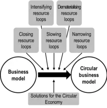 Circular business models can be defined as business models that are closing, narrowing, slowing, intensifying, and dematerializing loops, to minimize the resource inputs into and the waste and emission leakage out of the organizational system. This comprises recycling measures (closing), efficiency improvements (narrowing), use phase extensions (slowing), a more intense use phase (intensifying), and the substitution of products by service and software solutions (dematerializing).[89] These strategies can be achieved through the purposeful design of material recovery processes and related circular supply chains.[92] As illustrated in the Figure, these five approaches to resource loops can also be seen as generic strategies or archetypes of circular business model innovation. The development of circular products, circular business models, and, more generally, the circular economy is conditioned upon the affordances of the materials involved, that is the enablement and constraints afforded by these materials to someone engaging with them for circular purposes.[93]