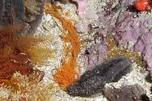 Orange thread-gilled worms grow to up to 10 cm in total length. They are soft bodied worms which lie buried in sand or mud or between mussels. Only the long tangled orange gills and soft food gathering tentacles are visible.[2]