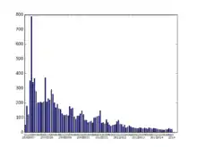 In March 2010, the project had 90 contributors who made at least one edit, with a core of 25 contributors who made more than 100 edits. Median word count dropped from 468 words per article in October 2007 to 151 in May 2010.[64] In June 2010, the number of users making 1, 20, or 100 edits per month all were at their lowest point since the project went public in March 2007.[64] By October 2011, only about a dozen members made edits on a typical day, and an Ars Technica headline called the Citizendium project "dead in the water".[9] In 2014, the number of Citizendium contributors was under 100 and the number of edits per day was about "a dozen or so" according to Winthrop University's Dean of Library Services.[65] In September 2015, only seven editors had been active in the previous 30 days.[66]