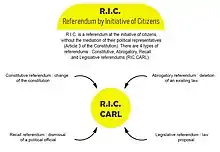 The Référendum d'initiative Citoyenne (abbreviated RIC) is the name given to the proposal for a constitutional amendment in France to permit consultation of the citizenry by referendum concerning the proposition or abrogation of laws, the revocation of politicians' mandates, and constitutional amendment.[2]