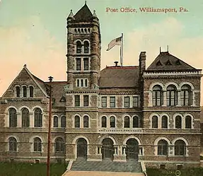 Williamsport City Hall, formerly the United States Post Office, is a historic building located at 245 West 4th Street between Government Place and West Street in Williamsport, Pennsylvania. It was built between 1888 and 1891, and is a 2 1/2 to 3-story building, with a two-story addition and six-story tower. The exterior is faced with rough-faced gray limestone ashlar. It was designed by the Office of the Supervising Architect under the direction of William A. Freret.[2]