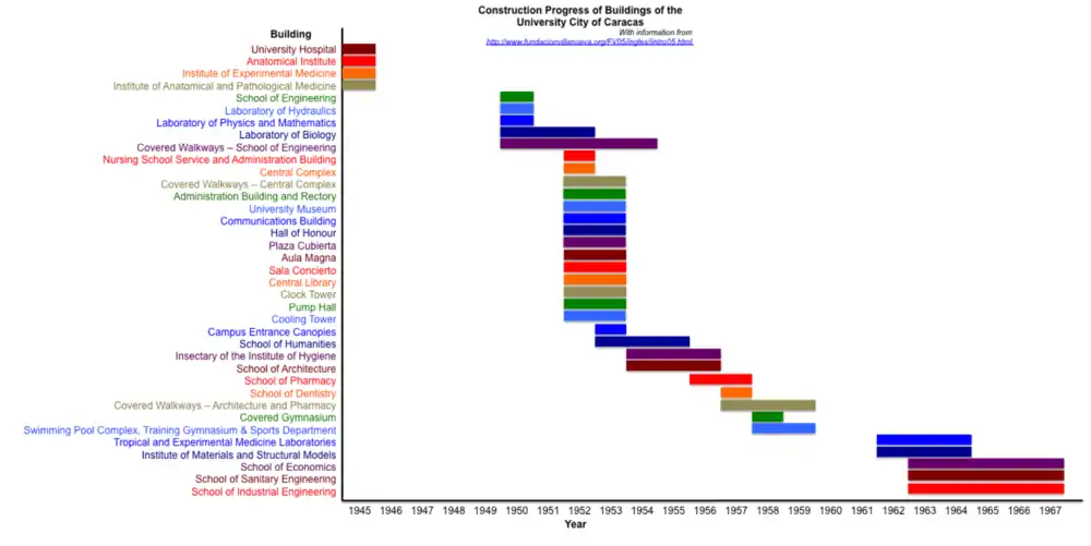 In 1939, commissioned groups began the new urban planning of Caracas, but "bureaucratic obligations" restricted this to Libertador municipality.[4]:55 The government of President Isaías Medina Angarita bought the Hacienda Ibarra in 1942, in order to expand the university beyond the limited space it had at the Saint Francis Covent. Shut down several times throughout the 1940s, the planning of the campus resumed towards the end of the Second World War.[4]:55 Construction began in 1944, and was continuous until 1967.[4]:57-59, 355 University City is an example of one of Villanueva's "museographic" spaces, which take the qualities of museums and apply them to public places.[4]:350