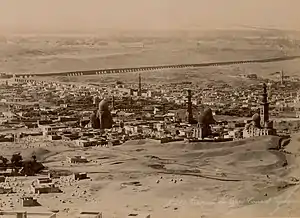 The Fatimids built a number of palaces and residences within the Greater Qarafa cemetery and along the roads between Fustat and their new royal city of al-Qahira (from which the name "Cairo" originates) to the northeast.[1] These did not supplant the Great Palaces (located on the site of Bayn al-Qasrayn today), but served as leisurely retreats from the city and as places to stay while visiting the tombs of Muhammad's descendants.[1][8] Along with their palaces, the Fatimids also built mosques, madrasas, and ribats for religious instruction and activities, all of which required the creation of infrastructure for water and other necessities.[1] Among other measures, the Aqueduct of Ibn Tulun, built to provide water to al-Qata'i and passing through this area, was repaired.[1] The most important of the constructions in the Qarafa appears to have been a monumental palace complex called "al-Andalus", built in 977 by Durzan (or Taghrid), the mother of Caliph al-'Aziz.[8][9] Caliph al-Amir (reigned 1100–1130) also reportedly resided in the palace.[1][8] Durzan also built a large mosque, possibly comparable in size and layout to the Mosque of Al-Azhar, described by contemporary chroniclers and known simply as the Qarafa Mosque.[8][9] The palace was later destroyed by Salah ad-Din and the mosque is no longer extant today.[8]