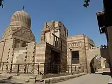 Directly south of the mosque, across the Salah Salem road, is the neighborhood of al-Qadiriya, centered around the street by that name. At its entrance are the remains of the Bab al-Qarafa, an old gate in the city walls giving access the Qarafa and which was rebuilt in the 15th century by Sultan Qaitbay.[7] It is now overshadowed by the Salah Salem bypass. A number of other historical mosques and monuments are in the area, including the Mausoleum and Zawiya of Shaykh Zayn al-Din Yusuf (dating from 1298 to 1299), on al-Qadiriya street, whose presence was probably an early catalyst for settlement in that area.[1] The cemetery on the eastern side of this neighborhood contains the remains of a cluster of monuments from the Mamluk era. They are architecturally impressive but have been partly destroyed over the years. They include the Mausoleum and Khanqah of Amir Qawsun (founded in 1335) and the so-called "Sultaniyya" mausoleum (believed to be dedicated to Sultan Hassan's mother, in the mid-14th century).[1][7]