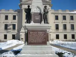 The DeKalb County Civil War Memorial and the sculpture that adorns it was created by an unknown sculptor and installed in front of the DeKalb County Courthouse in 1896.[2][3] The county-owned memorial stands on the public square in Sycamore, the county seat and is 50 feet (15.2 m) tall.[3] The structure was dedicated on June 24, 1897 as a memorial to the 2,388 people from DeKalb County who served in the military during the American Civil War.[3][4][5]
