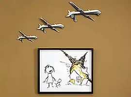 Civilian Drone Strike is a 2017 artwork by Banksy. The work depicts three General Atomics MQ-1 Predator drones flying above a child's drawing of a bombed house with a child and pet looking on at the destruction. The piece was donated to the Art the Arms Fair gallery and was exhibited to coincide with the 2017 DSEI arms fair.[1][2] The work sold for £205,000.[3] Proceeds from the sale have been donated to Campaign Against Arms Trade and Reprieve.[4]