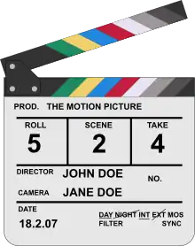The clapperboard combines a chalkboard slate or acrylic board with a set of clapper sticks across the top; one stick is fixed to the upper edge of the slate, while the other is attached to it by a hinge at one end. The slate displays the name of the production, the scene and "take" about to be performed, and similar information;[6] a camera assistant holds the clapperboard so the slate is in view of the cameras with the clapper sticks already open, speaks out information for the benefit of the audio recording, then snaps the sticks shut.[7]