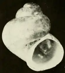| Black and white photo of apertural view of the shell of Clappia cahabensis | |