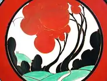 The Fantasque range evolved between 1928 and 1934 and mainly featured abstracts or landscapes of cottages and trees, as well as some Art Deco inspired patterns. The first Fantasque landscape pattern was Trees and House, which sold well from 1930 until at least 1934. However, it was the slightly later, more sophisticated Autumn pattern issued near the end of 1930 which was more popular. Originally created in red, coral-green, and black, from 1930 to 1931 many colorway variations appeared. The rarest is the red colorway, shown on a 13-inch (330 mm) wall plaque. The best selling version at the time was one with trees in blue, green, and yellow. All these variations are seen as collectibles.