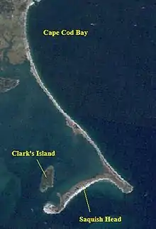 Clark's Island is the name of a small island located in Duxbury Bay in the U.S. state of Massachusetts.[1] It was named for John Clark, the first mate of the Mayflower, the ship that brought the Pilgrims to New England.[2] The island was initially considered for the location of the Pilgrim's settlement, but was rejected in favor of a site to the south, which became known as Plymouth, Massachusetts.[3] Today Clark's Island is a part of the town of Plymouth.[1]