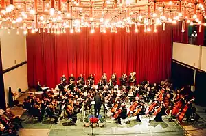 The Kosovo Philharmonic orchestra was formed in 2000, initially as a string ensemble and later as a chamber orchestra.[39] Immediately after its creation it was faced with financial troubles. Due to the lack of performers from Kosovo it is often necessary to invite guest performers from Macedonia and Albania. [40][41]