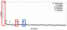 Well-crystallized and pure samples are ideal for x-ray diffraction, but this is rarely the case for clay.[5] Clay minerals are almost always mixed with very small amounts of nonclay minerals which can produce intense peaks, even when there is very little of the sample is not a clay. If additional minerals are known to be presents, attempts should be made to separate clays from nonclays otherwise additional peaks should be expected. Some common minerals associated with naturally occurring clays are; quartz, feldspars, zeolites, and carbonates organic matter is sometimes present.[3] Synthesis of clays can reduce the presence of some of these associated materials but does not guarantee pure samples as quartz or other associated materials are still commonly produced alongside synthetic clays.