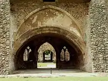 It is suggested from the heraldry used in the tiled floors of the refectory that it was finished at the end of the thirteenth century.[5] The encaustic tiles, which are 23 centimetres (9.1 in) square, include the arms of Henry III, Richard, 1st Earl of Cornwall and the Clare family.[8] It is believed they were produced to celebrate the marriage of Edmund, 2nd Earl of Cornwall and Margaret de Clare in 1272.[9] The final part to be finished was the small west range, which was used for storage and quarters for the lay brothers. East of the core buildings, and linked to them, was a second cloister around which was the monastic infirmary.[10]
