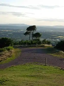 The Clent Hills lie 10 miles (16 km) south-west of Birmingham city centre in Clent, Worcestershire, England. The closest towns are Stourbridge and Halesowen, both in the West Midlands conurbation (and also historically in Worcestershire). The Clent Hills range consists of, in order from north-west to south-east: Wychbury Hill, Clent Hill (and Adams Hill), and Walton Hill (and Calcot Hill).[2] The north Worcestershire range of hills continues eastwards to include Romsley Hill, Waseley Hills and the Lickey Hills.[3][4]