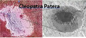 - ↑ "Cleopatra Patera". Gazetteer of Planetary Nomenclature. International Astronomical Union (IAU) Working Group for Planetary System Nomenclature (WGPSN). 2014-08-27. Retrieved 2014-10-16.