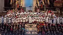 The annual Festival service at St Paul's Cathedral, which began on 8 November 1655, has continued ever since, and is a major event annually in the calendar of the charity and of the cathedral.[22] Senior clergy and City figures, including the Lord Mayor of London or their representative, are usually involved in the event, and in the life of the charity, with the Archbishop of Canterbury, Archbishop of York and Bishop of London serving as Presidents.[23] With two cathedral choirs joining the choir of St Paul's, and with several composers such as Charles Villiers Stanford, Hubert Parry and Edward Elgar having written pieces for the event, the Festival is now one of the oldest and best known choral events in the Anglican Communion.[24]