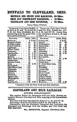 On January 10, 1850, the Cleveland, Painesville and Ashtabula Railroad (then in the process of surveying its own route) agreed to connect its line with the FCC at the Ohio-Pennsylvania border.[85] This simple written agreement required no actual construction, however, and was canceled. On August 26, 1850, the CP&A signed a new agreement which required it to build a line to the Pennsylvania border and connect it to the FCC's Lake Shore Division.[86] The CP&A further agreed to build the FCC's line for the canal company.[87][lower-alpha 22] The road from Cleveland to Erie would be operated as a single line by the CP&A,[82] although the locomotives, rolling stock, and other equipment needed to operate it would be purchased jointly by the two companies.[88][lower-alpha 23] Profits (or losses) were to be prorated to each company based on the length of road owned by each between Cleveland and Erie.[82] The contract went into force in December 1852.[89]