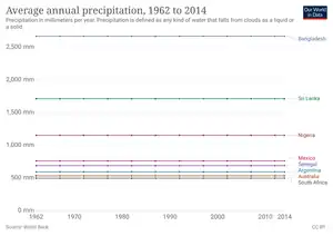 Climate change is predicted to have significant effects on the living conditions in Argentina.[2]: 30 The climate of Argentina is changing with regards to precipitation patterns and temperatures. The highest increases in the precipitation (from the period 1960–2010) have occurred in the eastern parts of the country. The increase in precipitation has led to more variability in precipitation from year to year in the northern parts of the country, with a higher risk of prolonged droughts, disfavoring agriculture in these regions.
