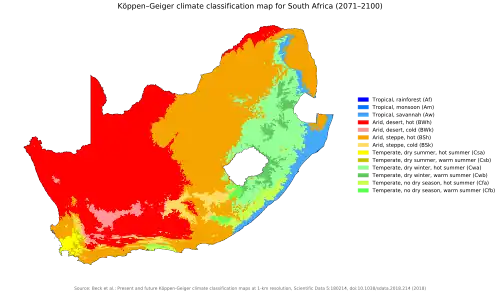 - ↑ Chersich, Matthew F.; Wright, Caradee Y.; Venter, Francois; Rees, Helen; Scorgie, Fiona; Erasmus, Barend (September 2018). "Impacts of Climate Change on Health and Wellbeing in South Africa". International Journal of Environmental Research and Public Health. 15 (9): 1884. doi:10.3390/ijerph15091884. ISSN 1661-7827. PMC 6164733. PMID 30200277.