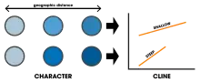 The steepness, or gradient, of a cline reflects the extent of the differentiation in the character across a geographic range.[2] For example, a steep cline could indicate large variation in the colour of plumage between adjacent bird populations. It has been previously outlined that such steep clines may be the result of two previously allopatric populations with a large degree of difference in the trait having only recently established gene flow, or where there is strong selection against hybrids. However, it may also reflect a sudden environmental change or boundary. Examples of rapidly changing environmental boundaries like this include abrupt changes in the heavy metal content of soils, and the consequent narrow clines produced between populations of Agrostis that are either adapted to these soils with high metal content, or adapted to "normal" soil.[2][18] Conversely, a shallow cline indicates little geographical variation in the character or trait across a given geographical distance. This may have arisen through weak differential environmental selective pressure, or where two populations established secondary contact a long time ago and gene flow has eroded the large character differentiation between the populations.