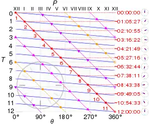 In this graphical solution, T denotes time in hours; P, hands' positions; and θ, hands' angles in degrees. The red (thick solid) line denotes the hour hand; the blue (thin solid) lines denote the minute hand. Their intersections (red squares) are when they align. Additionally, orange circles (dash-dot line) are when hands are in opposition, and pink triangles (dashed line) are when they are perpendicular. In the SVG file, hover over the graph to show positions of the hands on a clock face.