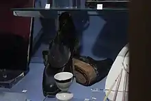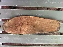 The traditional method of construction starts with gangs of itinerant woodsmen who would buy a stand of timber for the felling.[12] The regular gangs would operate in a similar fashion to coppice workers and circulate around 12 stands in 12 years to allow regrowth.[13] The timber was felled and sawn to length. Logs from larger trees were split; that from smaller coppice wood did not require splitting.[14] The billets were roughly shaped with a stock knife and a deep notch put in where the sole and heel meet.[lower-alpha 2] All the work was done in green wood which is easier to work than seasoned wood.[14] The clog blocks were then generally stacked up in open pyramids to allow the air to circulate and seasoned for a few months.[14] The offcuts and waste was sold on, either as pea-sticks and firewood to provide money for food or else as fuel to the wool dyeing trade.[12][14]