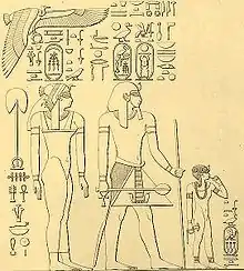 Although heads were shaven as both as a sign of nobility[10] and due to the hot climate, hairstyle was a huge part of ancient Egyptian fashion through the use of wigs.[11] Wigs were used by both sexes of the upper and lower class; the quality of wigs depended on the amount of disposable income available,[12] which created a visual rift between classes. Good quality wigs were made of human hair and were ornamented with jewels and woven with gold.[11] In the court, the more elegant examples had small goblets at the top filled with perfume; Pharaohs even wore wig beards for certain special occasions.[11] There is evidence of cheaper wigs made from wool and palm fibres, which were further substituted the woven gold used in its more expensive counterpart with beads and linen. The ancient Egyptians talent with substitution enabled wigs and headdresses to be worn by all social classes; for example. the nemes headdress, made from stiff linen and draped over the shoulders was reserved for the elite class to protect the wearer from the sun. On the other hand, headdresses such as the pschent were exclusive for the Pharaoh.[5] Pharaohs also wore various crowns to identify different divinities, such as the horned crown of the goddess Hathor. In both social classes children were represented with one lock of hair remaining on the right side of their head[12] (see the adjacent image). The most common headgear was the kaften, a striped fabric square worn by men.