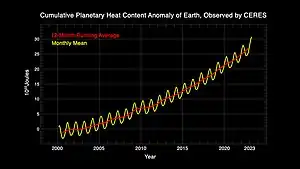 A study of annual changes to Earth's energy imbalance (EEI) spanning 2005-2019 showed good agreement between the CERES observation and EEI inferred from in-situ measurements of ocean heat uptake by the Argo float network.[22]