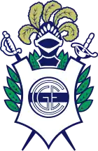 The current shield of Gimnasia y Esgrima is a wreath in which, in the top part, a helmet is outlined with a heraldic crest. At the center, on enamel and with the colors of the club (white and navy blue), is the club monogram appears. In the top cantons, like a guard, there appears the hilts of a saber and a foil, with their sharp points emerging in lower part of the shield. To the sides of the center laurels spread around the helmet.[1][22]
