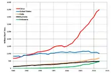 The U.S. is a net exporter of coal.[51] US net coal exports increased ninefold from 2006 to 2012, peaked at 117 million short tons in 2012, and were 97 million short tons in 2017.[3] In 2015, 60% of net US exports went to Europe, 27% to Asia.[52] The largest individual country export markets were the Netherlands (12.9 million short tons), India (6.4 million short tons), Brazil (6.3 million short tons), and South Korea (6.1 million short tons). Coal exports to China, formerly one of the major markets, declined from 8.3 million short tons in 2013, down to 0.2 million tons in 2015.[25][53]