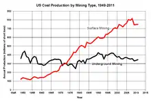 US employment in coal mining peaked in 1923, when there were 863,000 coal miners.[46] Since then, mechanization has greatly improved productivity in coal mining, so that employment has declined at the same time coal production increased. The average number of coal mining employees declined to 41,600 in 2020.[1] This was below the previous low of 70,000 in 2003, and the lowest number of US coal miners in at least 125 years.[47][48]