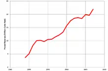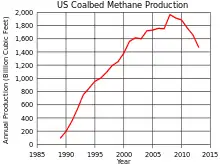 The 2017 production of coalbed methane in the United States was 0.98 trillion cubic feet (TCF), 3.6 percent of all US dry gas production that year. The 2017 production was down from the peak of 1.97 TCF in 2008.[1] Most coalbed methane production came from the Rocky Mountain states of Colorado, Wyoming, and New Mexico.