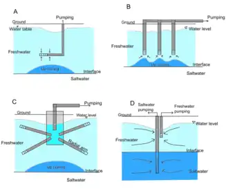 Pumping of groundwater from a well near the interface could cause seawater up-coning where seawater intrudes vertically to the aquifer.[21][22] When the pumping rate exceeds the maximum pumping rate or critical pumping rate, seawater would be pumped out.