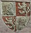 Its blazon is: "Quarterly, I: Gules, a lion rampant queue fourch erect facing sinister Argent, armed and langued Or outlined Sable, crowned Or outlined Sable; II: Or, an eagle Sable charged with across its breast and wings a crescent Argent upward pointing with a crosslet Argent attached rising from the middle; III: Or, a capital letter 'W' Sable serifed; IV: Gules, the head and shoulders of St. John the Evangelist gardant Argent, with youthful face and long hair Argent outlined Sable and with halo Or outlined Sable, issuant from an inverted crown Or outlined Sable. Surmounting all at center a roundel Argent, double-bordered in Sable, charged with St. John the Baptist's head Argent, with beard and hair Sable, semi-gardant turned toward the dexter."
