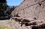 Based on second-hand accounts, the wall at Tenochtitlán was thought for many years to have enclosed the entirety of the sacred precinct of Tenochtitlán and consist of numerous snakes,[4] but archaeological work in 1981 revealed that the sacred precinct of the city extended beyond the coatepantli and that the coatepantli consisted of two walls in the form of large snakes with painted heads, surrounding the Templo Mayor.[3][4] One snake was situated to the north of the temple and was painted blue to represent the rain god Tláloc. The other, around the southern side of the pyramid, was painted ochre and represented the war god Hitzilopochtli.