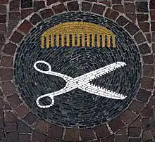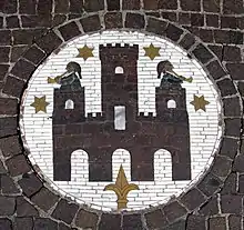 In the city centre of Freiburg, round mosaics in the paving can be found almost everywhere. These mosaics often show symbols of trade or historical references to the building that lies behind it. Some of these mosaics have mere ornamental character, others display emblems, coat of arms or short brand names.